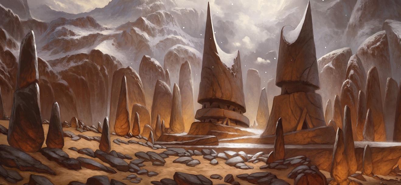 Местность выглядит необитаемой и практически безжизненной: нет ни животных, ни растений, лишь кое-где проглядывают мхи и лишайники, ухитряющиеся выживать на камнях. Здесь, однако, имеются следы цивилизации: посреди плато возвышаются две массивные (каждая примерно с трехэтажный дом) башни, вырезанные из камня, окруженные россыпью менгиров. Святилище безлюдно, однако судя по внешнему виду, за ним ухаживают, кроме того, от шпилей исходит слабое ощущение присутствия магической энергии, в которой, свою очередь, скрывается нечто угрожающее. Немного присмотревшись можно также обнаружить узкую тропинку, уходящую вниз от каменной площадки.